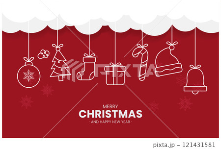 Merry Christmas Text with Hanging Elements on Red Background - Vector illustration