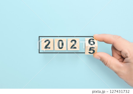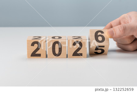 Hand flipping wooden block to change date from 2025 to 2026. New year resolution and future business planning concept