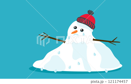 Cuite sad melting snowman with red cap and tears in flat cartoon style, isolated on blue green background. Vector EPS 10 illustration. End of winter and frost, arrival of spring concept