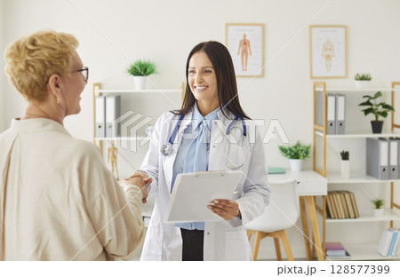 Female doctor smiling and shaking hands with older patient in bright office during consultation.