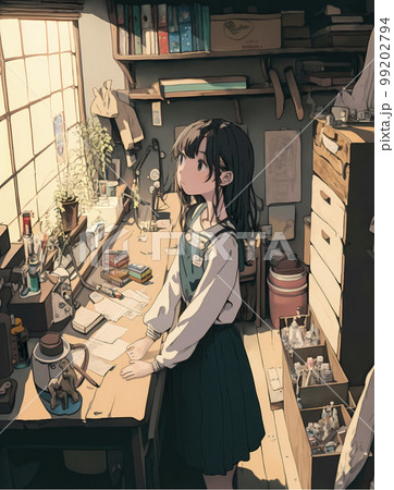 いろんな物に溢れた乱雑な部屋にいるセーラー服姿の女子生徒「AI生成画像」