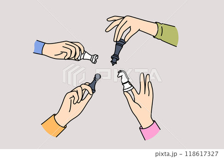 Chess in hands of people from opposing teams, as concept of strategic confrontation between rivals