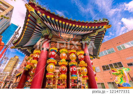 日本の横浜都市景観2025春節燈花。山下町公園・憩いの場「會芳亭」前に龍などが登場…=12日