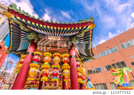 日本の横浜都市景観7年2月。2025春節燈花。山下町公園・「會芳亭」から聖獣たちを望む…=7日