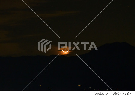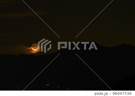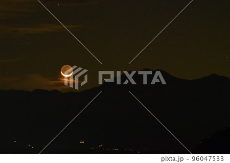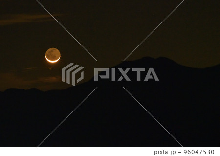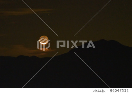 北杜市白州町、茅ヶ岳から昇る月齢27.2地球照の細い月