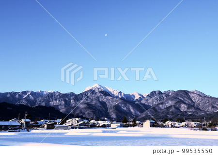 北杜市白州町、雪の朝明け行く山並みと街並みの上には月齢19.3の残月