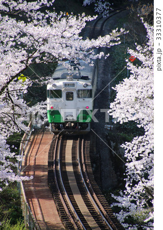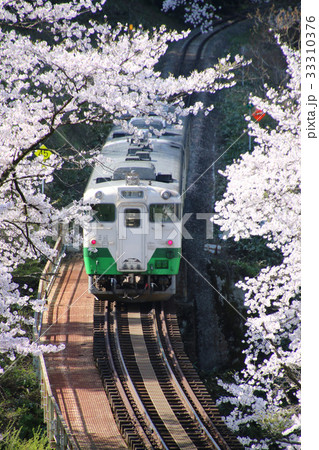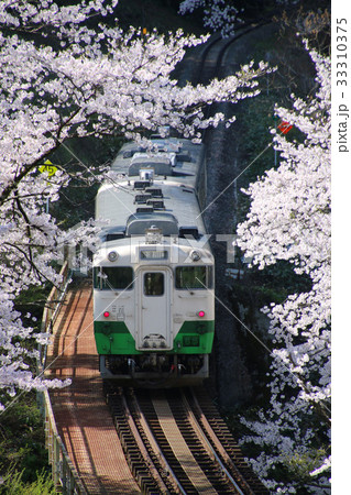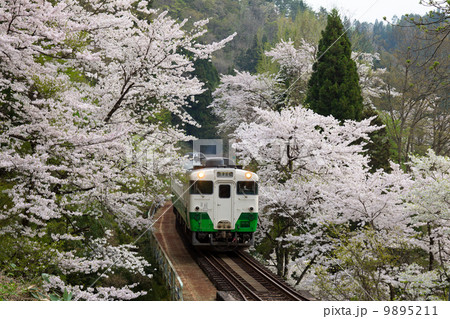 桜のトンネルを走る只見線の列車(福島県柳津町、4月下旬)