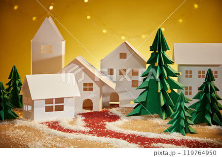 Horizontal image template with winter theme, shows the paper houses placed side by side, next to green paper pine trees placed on a snow-covered surface, golden background with colorful LED strings.