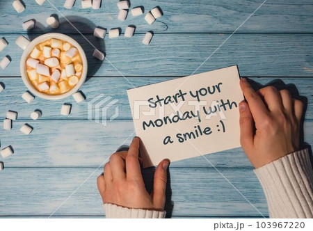 START YOUR MONDAY WITH A SMILE concept text Female hands holding card with white cup of coffee and marshmallows on wooden background. The most depressing day of the year in January. Day commit suicide
