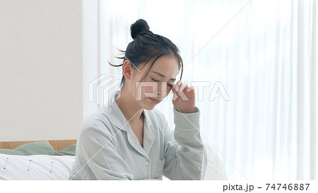 Business woman with a sad face is lying lazy on a bed ,illustration, AI generated