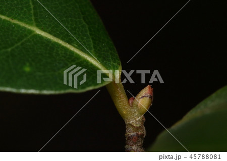 自然 植物 ゲッケイジュ、冬芽です。頂芽は伸び始め?葉腋から出ている球形の花芽が目立ちます