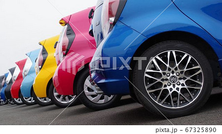 販売店に並ぶ車 カラフルなハイブリッドカー