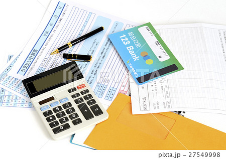 預貯金やローン支払いのイメージ (日本のお金、通帳、電卓)