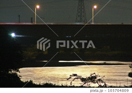 日が落ちた利根川の川面に姿を映す2023年のストロベリームーン。6月の満月で月齢15.5。
