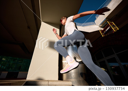 Athletic woman running outdoors near modern architecture in bright sunlight
