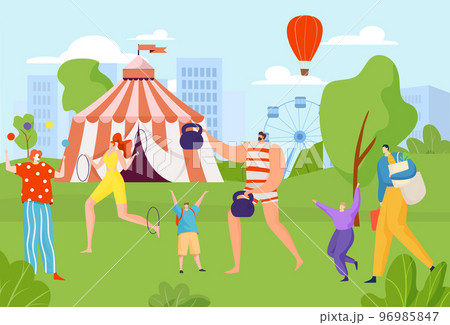 Carnival circus in park, vector illustration, amusement fair with tent, flat people charcater at outdoor entertainment show for children.
