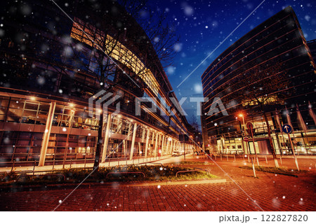 Panorama of the night city of Dusseldorf in winter during a snowstorm. Bokeh light effect, soft filter
