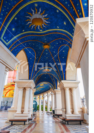 Modern columns with an arch and beautiful painted ceiling outside the palace in Ba Na Hills Park in Da Nang in Vietnam