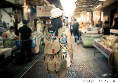 woman tourist walking in Amphawa street
