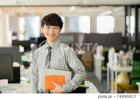 立った姿勢でノートパソコンを両手で持って笑顔な表情のビジネスパーソン
