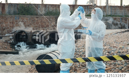 Ecologist sampling water from the river with test tube, Scientist or Biologist in a protective suit and protect mask collects sample of waste water from industrial for analyze, problem environment