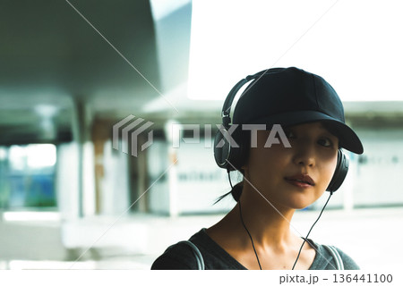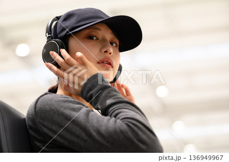 ヘッドホンで音楽を聴く女性 ■撮影協力:関西国際空港(KIX)