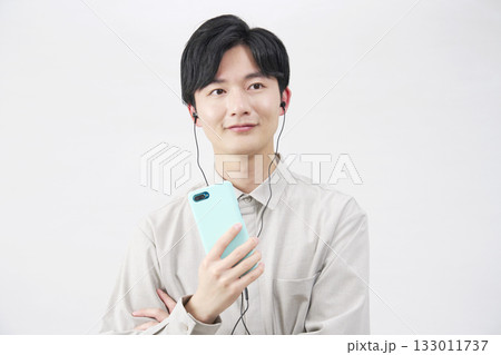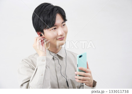 イヤホンをつけて音楽を聴く20代男性 白背景