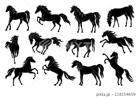 Horse silhouette. Black and white rearing stallion, wild mustang. Equestrian animal race, farm speed. Mustang jumping running, trotting. Vector icon, logo isolated illustration set