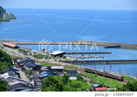有間川の漁港と街並みを縫って走るえちごトキめき鉄道観光急行