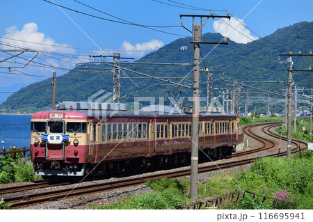 日本海ひすいライン「日本海を背景に走る国鉄急行列車」