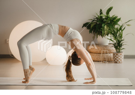 A girl in white clothes does yoga standing on the bridge on a mat indoors