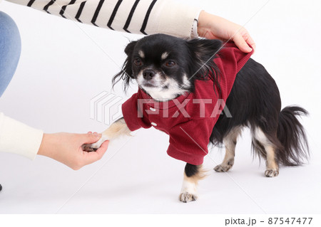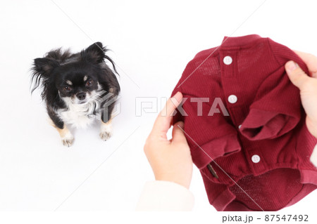 飼い主が持っている赤い犬用の洋服とロングコートチワワ
