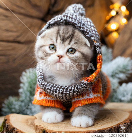 冬の防寒着を身に着けた可愛いスコティッシュフォールドの子猫