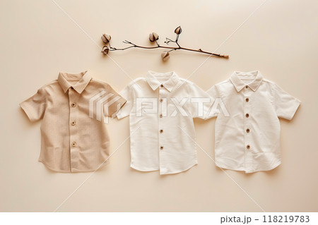 Baby onesie set on a beige background. Fashion newborn clothes. Flat lay, top view. Baby kids soft clothing made from organic cotton. Infant trendy bodysuit natural colors, earth tones. Gender neutral