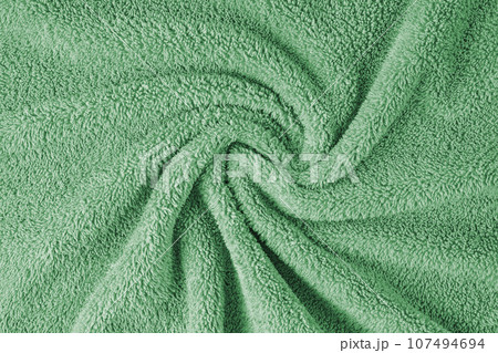Terry cloth, green towel texture background. Soft fluffy textile bath or beach towel material