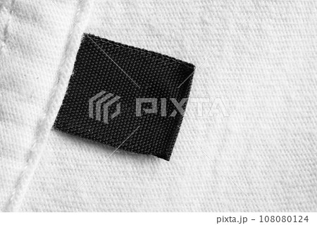 Black blank laundry care clothes label on white cotton shirt background