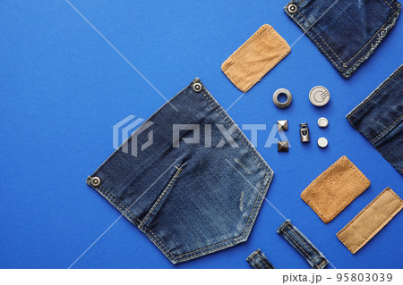 Flat lay composition with garment accessories and cutting details for jeans on blue background