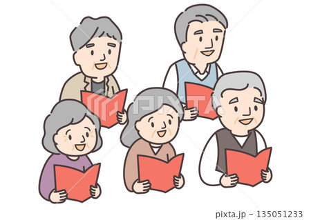 朗読や合唱を楽しむ高齢者5人のイラスト