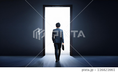 光が射し込むドアの前に立つ男性ビジネスマンのシルエット。挑戦のコンセプト。AI画像。