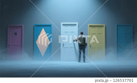 複数の扉から1つの扉を選択しようとする男性 進路に悩む男性