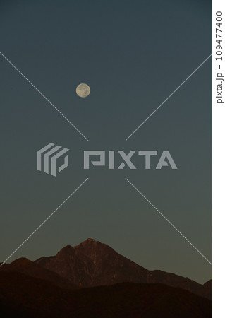 甲斐市宇津谷、朝焼けの南アルプス甲斐駒ケ岳の上に十月の満月ハンターズムーン