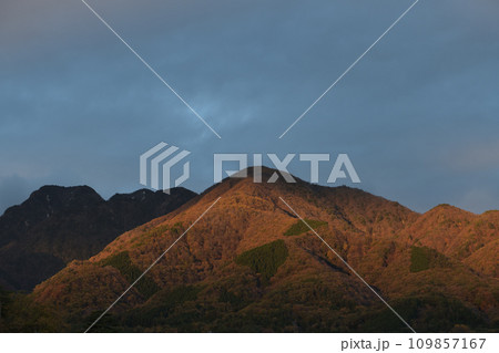 麓白州から見る朝日が照らす日向山。左奥は鞍掛山