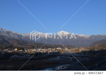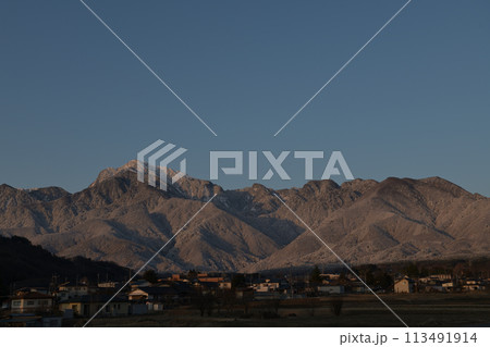 北杜市武川町、春、武川の街並み明け行く残雪の南アルプス