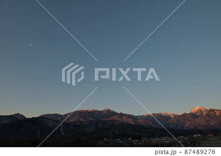 朝日が当たる南アルプス甲斐駒ケ岳の白き峰、麓の街並み