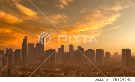 Air pollution. Smog and fine dust of pm2.5 covered city in the morning with orange sunrise sky. Cityscape with polluted air. Dirty environment. Urban toxic dust. Unhealthy air. Urban unhealthy living.