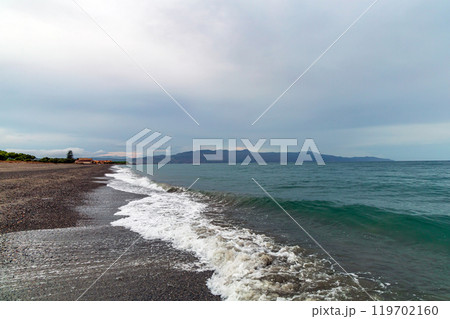 Beach on a cloudy morning. Sea wave on the coast of Greece.
