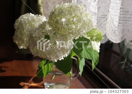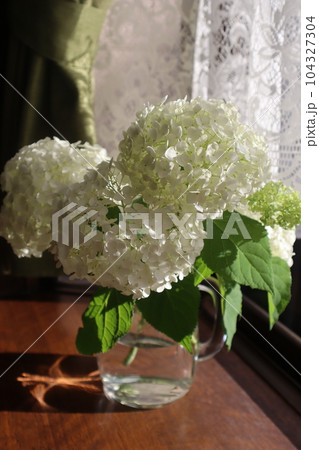出窓に庭のアナベルを生ける