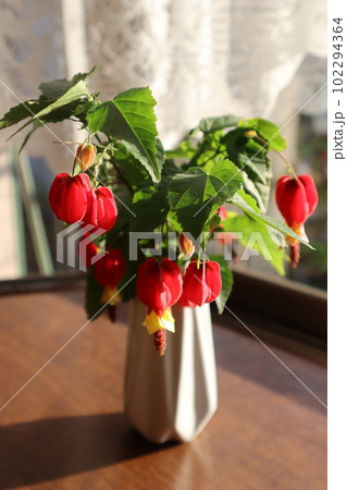 朝陽を浴びる窓辺のアブチロン・チロリアンランプの花
