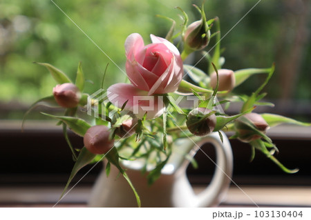 窓辺にピンクのバラの一輪挿し