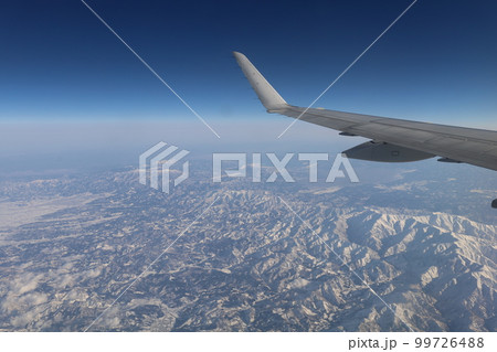 冬の日本本州縦断、空撮、JALジャルで飛ぶ花巻空港~大阪伊丹空港、東北の雪山、北アルプス、佐渡島